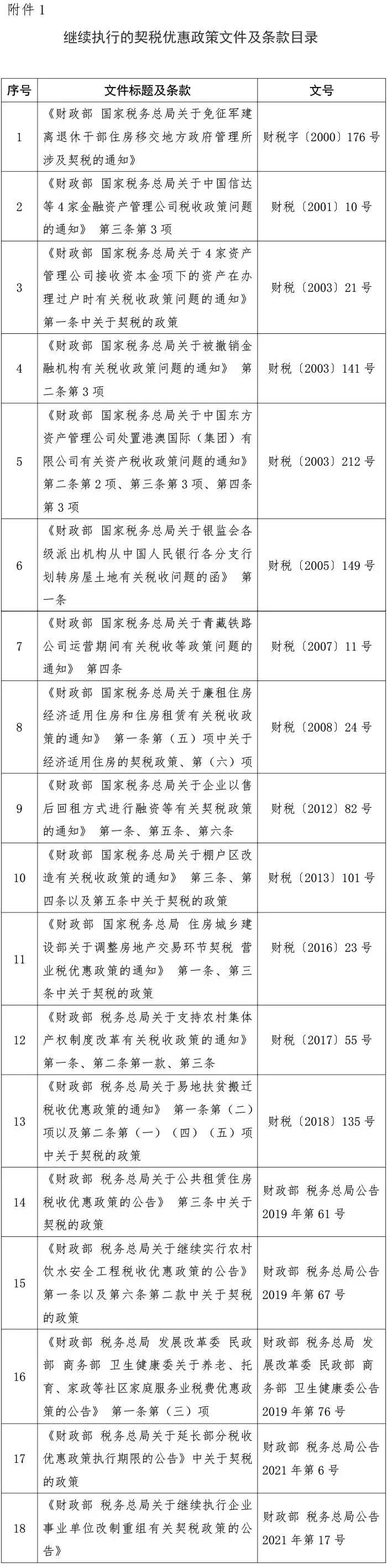 繼續(xù)執(zhí)行的契稅優(yōu)惠政策文件及條款目錄